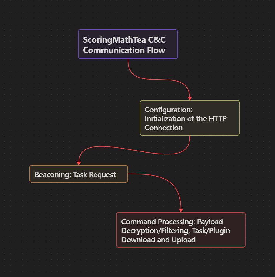 Therefore, based on all this analysis, the research concludes that ScoringMathTea is a modular Remote Access Trojan (RAT), designed for evasion, with a sophisticated architecture to avoid detection both on the network and at some endpoint aspects. Its C&C communication, operating over HTTP/S with SSL bypass, is a multi-layered channel that protects its command payloads through Base64 encoding, encryption (likely TEA/XTEA in CBC mode), and optional compression. The malware’s core capability it’s a reflective plugin loader capbility, that load a plugin in DLL format, allowing the operator to download and execute plugins entirely in memory.