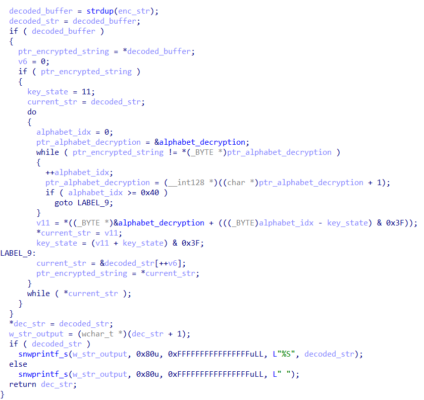 Finally, the algorithm stores the pointer to the decoded string (in char* format) in the first argument and then converts and copies the deobfuscated string to an adjacent wide string buffer (wchar_t*). Below we can see the pseudocode of this algorithm:
