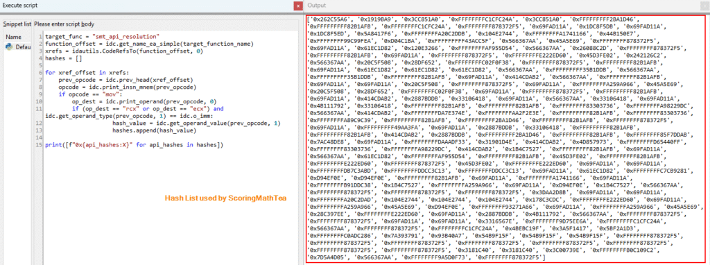 In each iteration of AddressOfNames, the collected result will be submitted to the ScoringMathTea hashing algorithm, as can be seen in the pseudocode below.