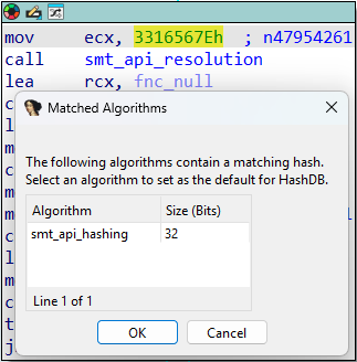 Since the hashing algorithm is relatively simple, it’s possible to create a Python script to automate the API hashing process. I implemented this and submitted a Pull Request to the OALabs open-source project, HashDB, with the goal of automating the de-hashing and facilitating static analysis. With the Pull Request accepted, it is now possible to look up the hashes of the current ScoringMathTea samples.