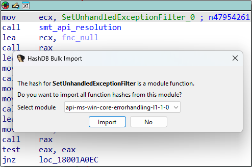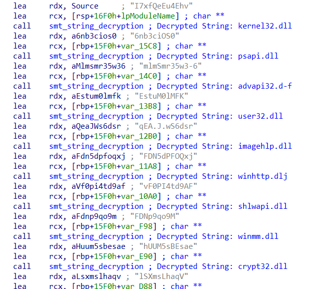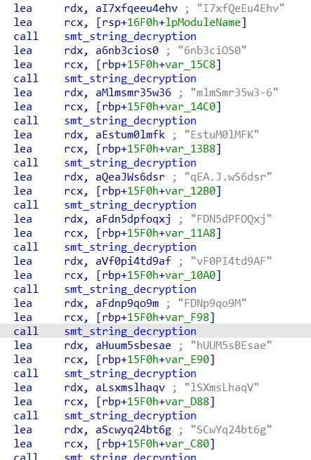 Thus, it can be observed that the deobfuscated strings in the API resolution function (smt_api_resolution) are DLLs that will be used throughout. Let’s continue with the analysis of the API loading routine via API Hashing.
