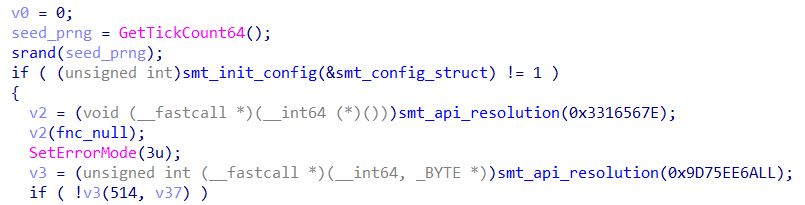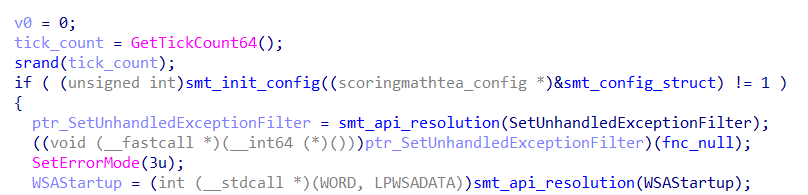 Upon reaching this function, we can already observe the creation of a pseudo-random seed using GetTickCount64 followed by srand, followed by a function that initializes some fields of the ScoringMathTea configuration struct, and finally arriving at the identification of the API resolution technique via API Hashing.