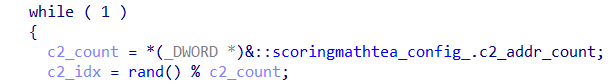 The second phase consists of the main communication loop with the C&C server, where the agent enters an infinite loop to try to connect with one of its C&C servers. This is not the case with this sample, but as previously seen, ScoringMathTea has the capability to have multiple C&C addresses; therefore, the main action of the ScoringMathTea’s main function is to randomly select a C&C address. However, as we already know, this sample only has one C&C address.