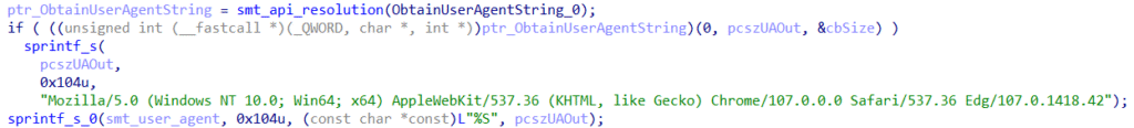 - Spoofing the User-Agent for further communications: `Mozilla/5.0 (Windows NT 10.0; Win64; x64) AppleWebKit/537.36 (KHTML, like Gecko) Chrome/107.0.0.0 Safari/537.36 Edg/107.0.1418.42`