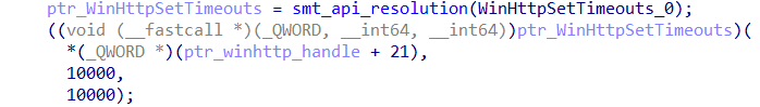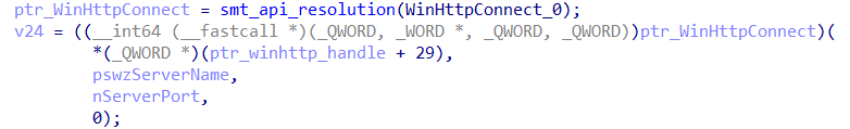 - Initial connection to the C&C server via the WinHttpConnect API, returning a connection handle;