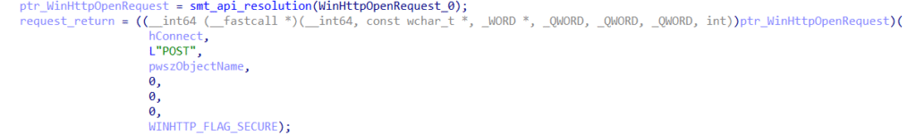 HTTP POSTrequest via the WinHttpOpenRequest API, using the connection handle created previously. A beacon is likely sent to the C&C server here;