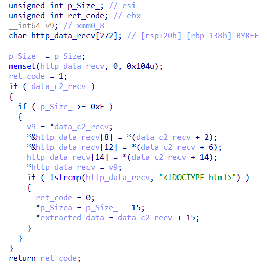 Firstly, the function that receives the identifier of the previously configured connection seems to construct a pseudo-random request payload (using rand()) from some constants, making it difficult to detect the beacon sent to the C&C using static signatures. An interesting feature of ScoringMathTea’s communication is that, when connecting to the command and control (C&C) URL, if the HTML document header is identified, the function removes this “header” and adjusts the pointers so that the rest of the code can process the actual payload that comes next.