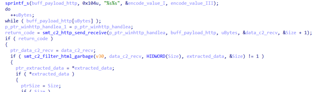 Below, we can see the execution of the function that sends the beacon and receives the response from the C&C (smt_c2_http_send_receive), followed by the function that filters the contents of the buffer received by the C&C.