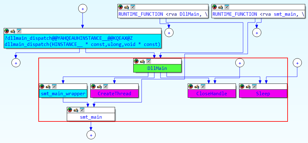 In the image below, we can observe the flow identified by the Proximity Browser, which leads from DllMain to the Main function of ScoringMathTea.