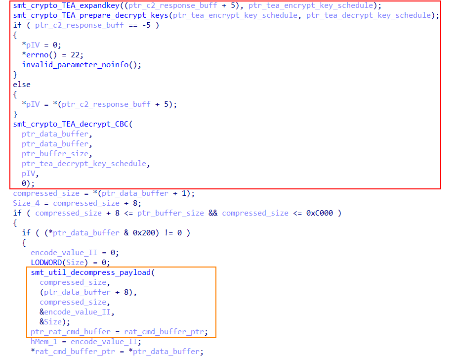 After stripping the header, the agent will receive an encrypted payload, extract a key and an Initialization Vector (IV) from it, and use this key to generate a decryption key schedule through two preparation functions. Then, it uses this key schedule and the IV to decrypt the payload in-place using a variant TEA algorithm in CBC mode. Finally, the resulting plaintext payload is checked; if a flag in the header indicates that the data is compressed, it decompresses it before moving the final command to an execution buffer. Below, we can observe the flow of this execution.