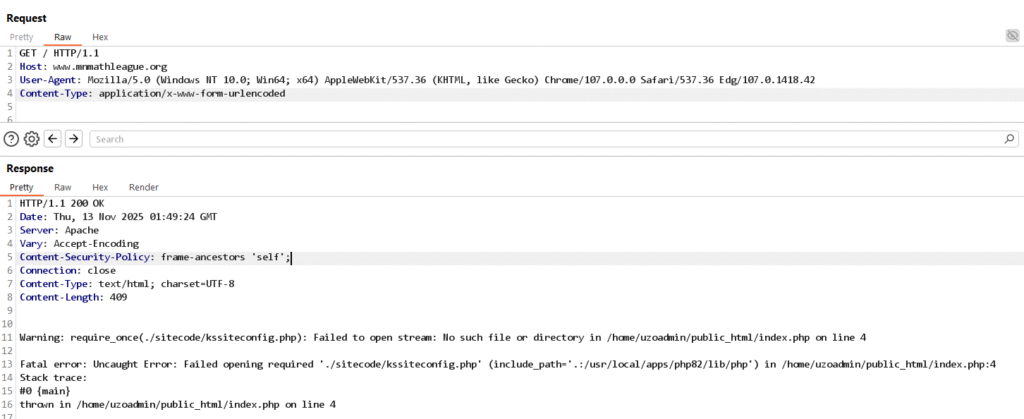 And when we simply send a GET request to the root domain, we get a fatal PHP error, indicating that the website is indeed fake, not even containing a page at the root of the domain.