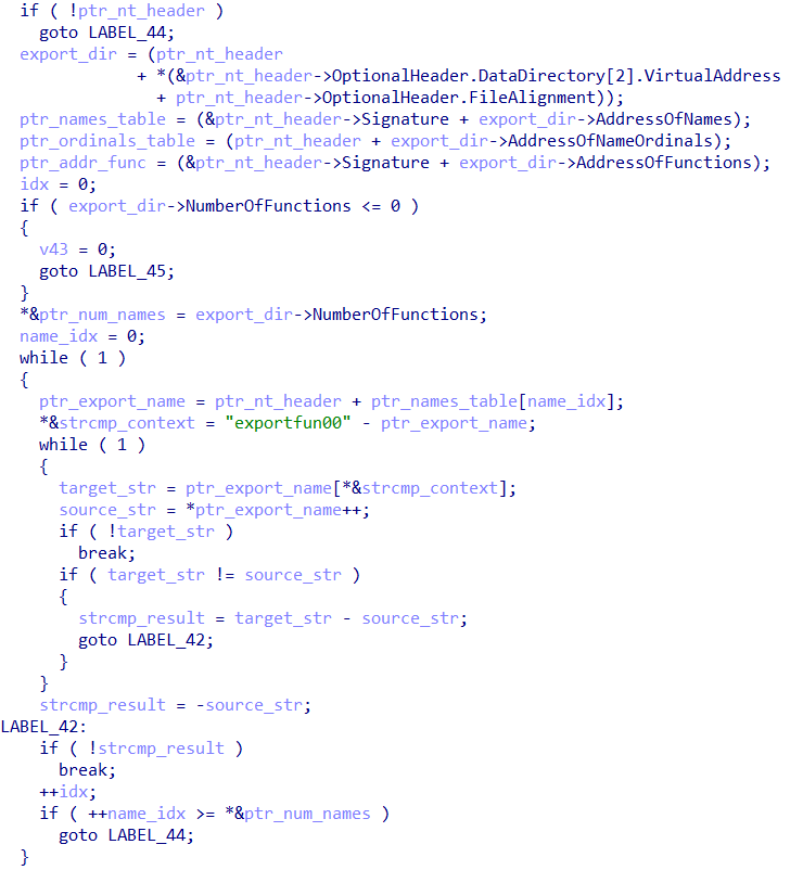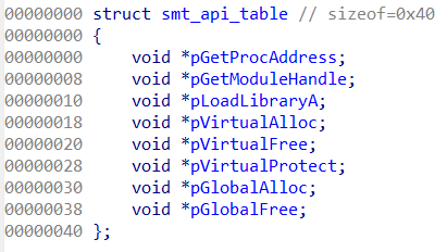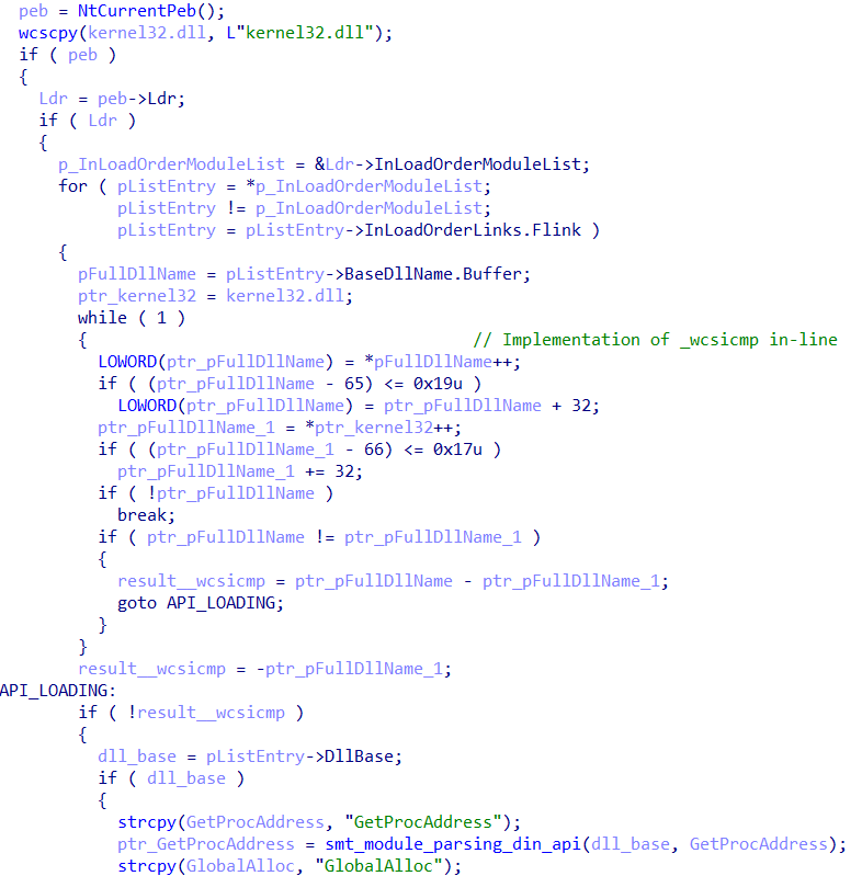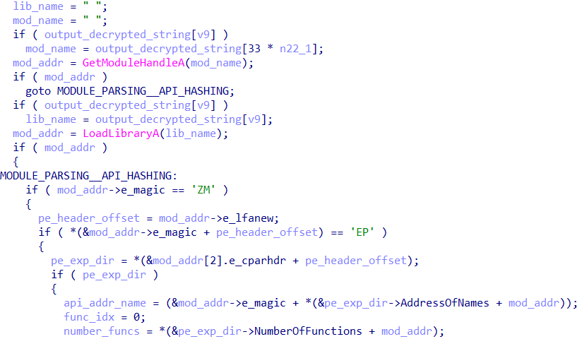 After deobfuscating the strings, the smt_api_resolution function will perform PE parsing of the desired module (DLL), with the aim of collecting the names of the APIs exported by that DLL, using AddressOfNames in the IMAGE_EXPORT_DIRECTORY.