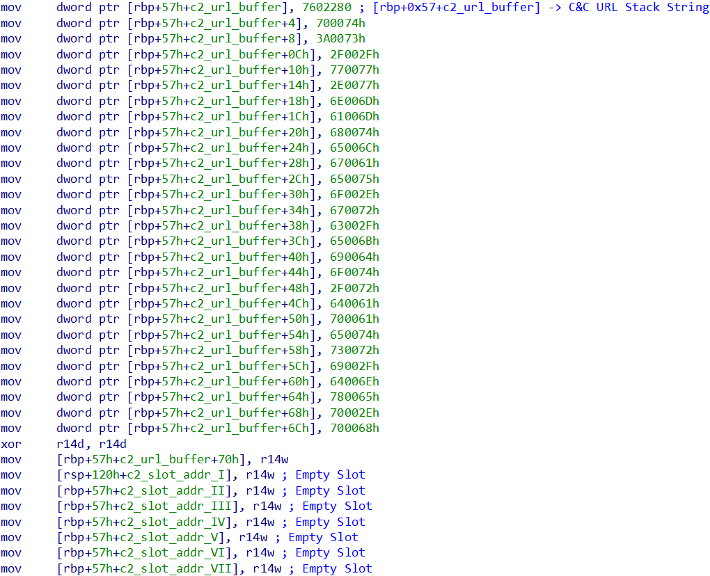In addition to the URL address, it is also possible to observe the creation of slots for more C&C addresses, which were declared as null, but which I believe could be added during the operation.