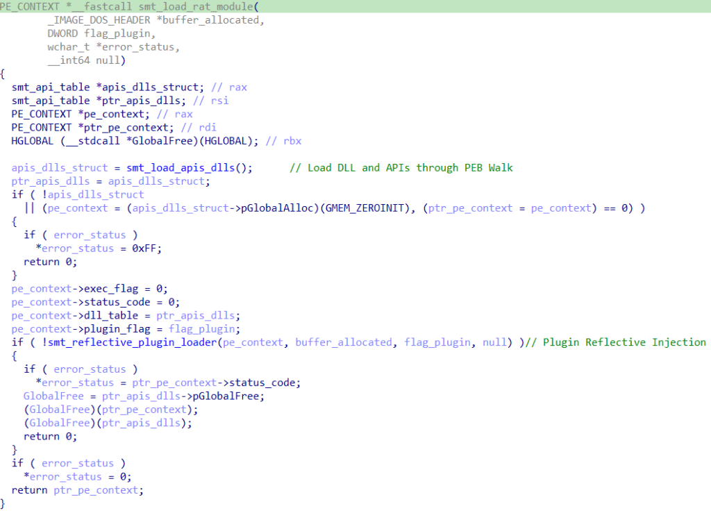 Finally, this function manually implements the Windows Loader, ensuring that the plugin received by C&C was properly loaded manually, thus avoiding detection by certain cybersecurity products.