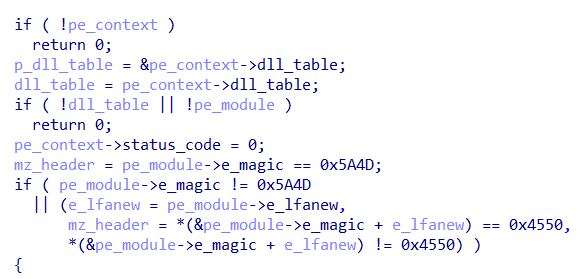 Right at the beginning of the function, it’s possible to see that the plugin must be a PE artifact, since the function checks both DOS and PE headers.
