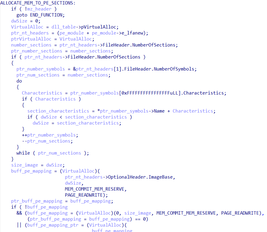 The function then manually maps the PE plugin in memory, allocating memory regions for each section. Basically, this function implements the Windows Loader manually and in a customized way, to avoid detection by cybersecurity products.
