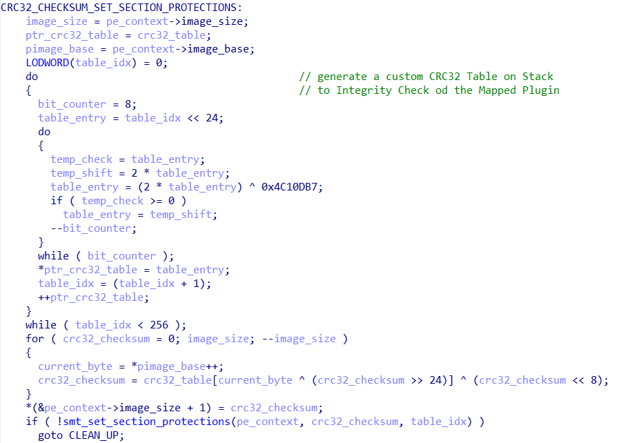 This function also implements a custom in-line CRC32 algorithm, which creates the CRC32 table on the stack and performs a checksum of the mapped plugin, in order to guarantee the integrity of the plugin and that everything has gone as expected. This is also an efficient method for detecting software breakpoints in debuggers. After generating the checksum, the function calls a routine to modify the protections of the previously allocated memory regions, in a manner appropriate for each section.