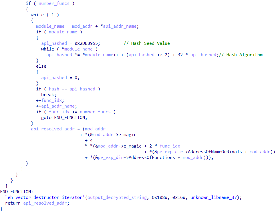 The while loop will check if the resulting hash from each API in each iteration matches the hash received as an argument to this function. The hashing process for each API name begins with a fixed seed value (api_hashed = 0x2DBB955), with its main logic described as:api_hashed ^= (char)*v18++ + (api_hashed >> 2) + 32 * api_hashed.