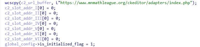 In the smt_init_config function, several fields of the struct that stores certain configuration aspects of ScoringMathTea are initialized. Below, we can see the storage via Stack Strings of the C&C URL of this sample. The use of Stack String is strategic so that the URL address is not easily identified by any string extraction tool.