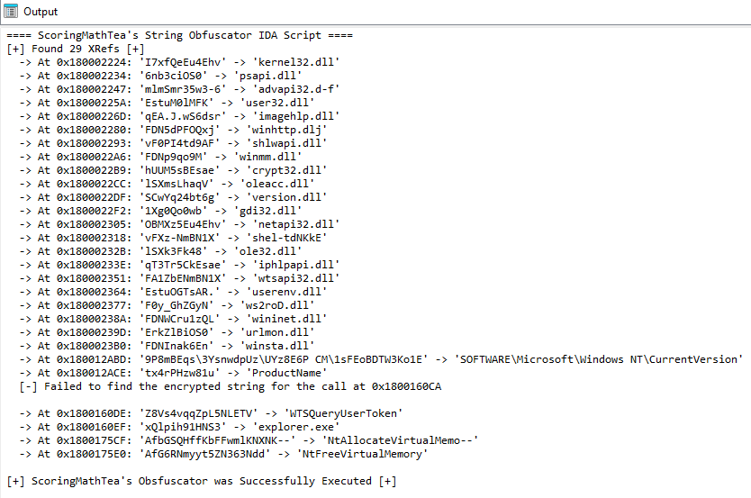 This allows the string decryption process to be automated within IDA itself, making the analysis more fluid with the comments placed in the Disassembler. Below is the output of the script in the IDA Pro Output window.