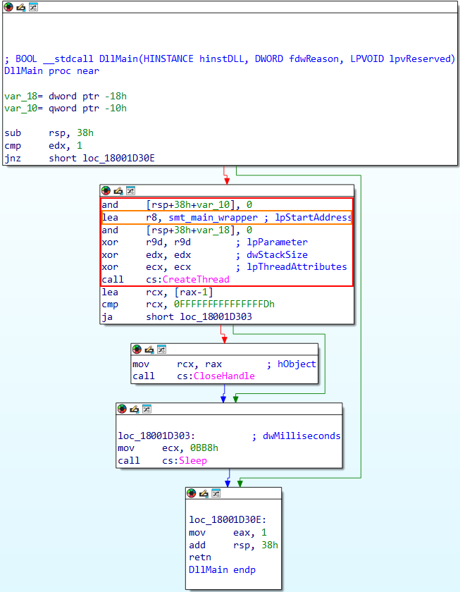 The sample we are going to analyze is ScoringMathTea in DLL format. When we open it in IDA Pro, the first function that appears is DllMain, which simply creates a thread through CreateThread WinAPI, setting the lpStartAddress as a wrapper function for the main function of ScoringMathTea.