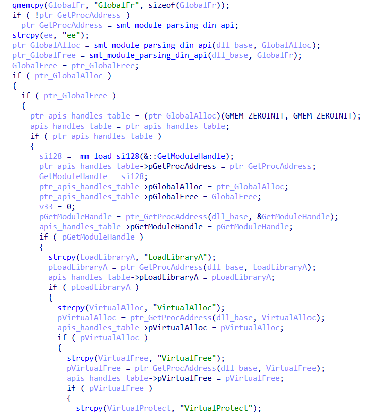 When we enter the smt_load_apis_dlls function, we can observe the implementation of the PEB Walking technique, with the goal of dynamically loading kernel32.dll, and a series of 7 APIs, which will be used later.