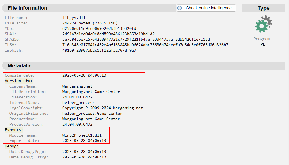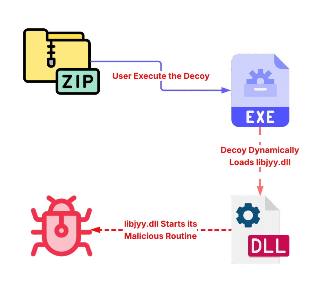 And this is the only function of this decoy, to load the real malicious payload which consists of the hidden DLL named libjyy.dll.