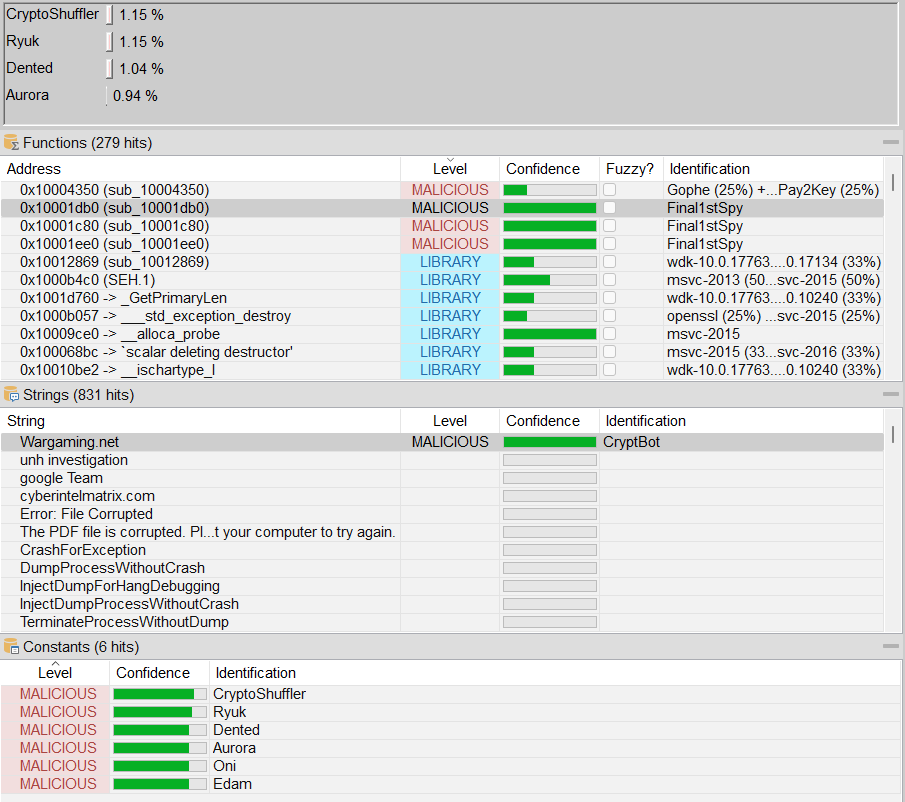 By submitting this sample to Kesakode, we can observe some functions identified as malicious, and further identify the malware family in which the function is related. We can also observe unknown strings identified as malicious, as well as malicious constants identified in this sample that are known to have been observed in other malware families listed in the image below.