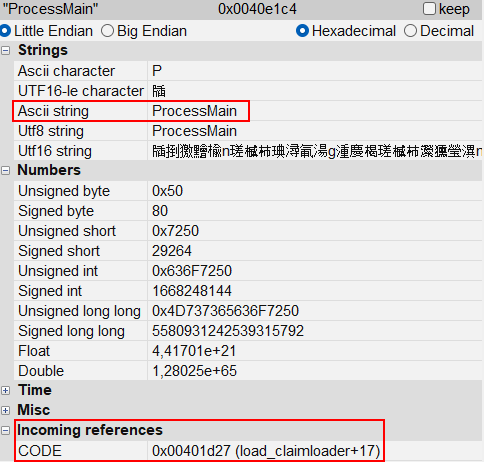 Below you can see two unknown functions (which I renamed) and unknown strings, one of which even allows us to assume it is the name of a function (ProcessMain).