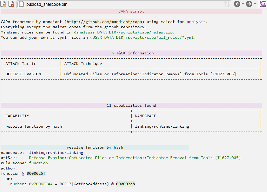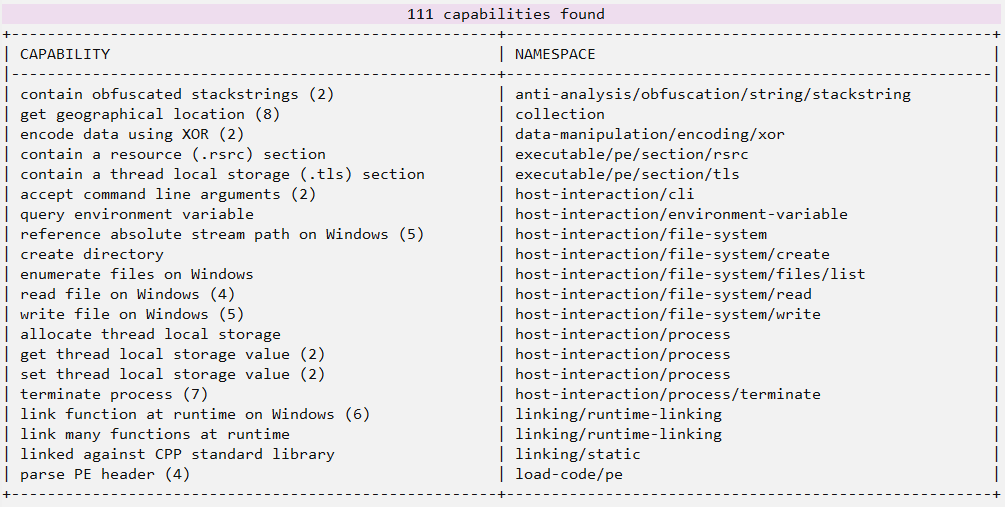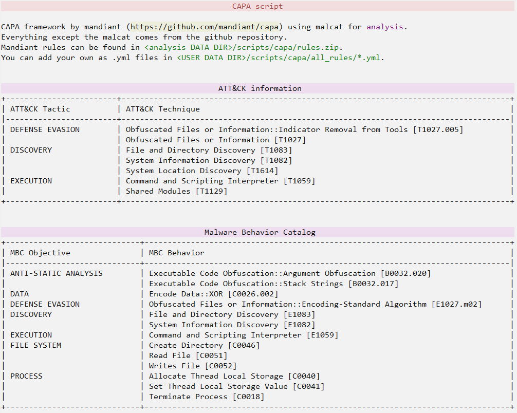 In addition to the screening features already explored above, Malcat also allows us to use CAPA to expand screening by identifying potential capabilities implemented in the sample. Below is the output of the capabilities identified by CAPA integrated with Malcat.