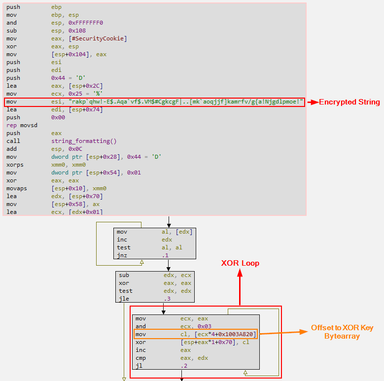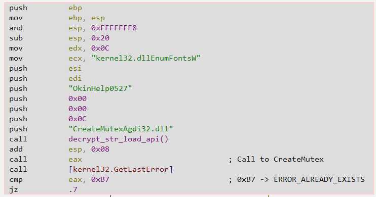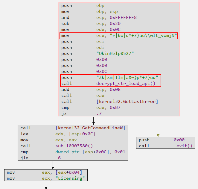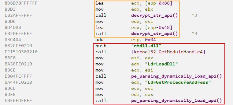 Below, we can see two encrypted strings being moved to the Stack, with the aim of being decrypted and finally, dynamically loaded through the function (renamed by me) decrypt_str_load_api.