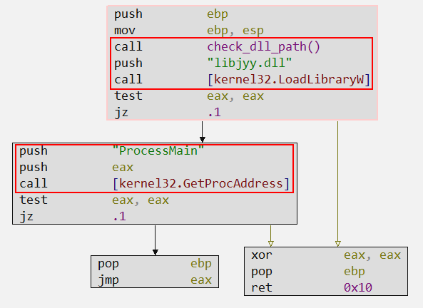 Now that we have enough information, let’s start our in-depth analysis through the function in which the decoy loads and calls libjyy.dll, ProgramMain.