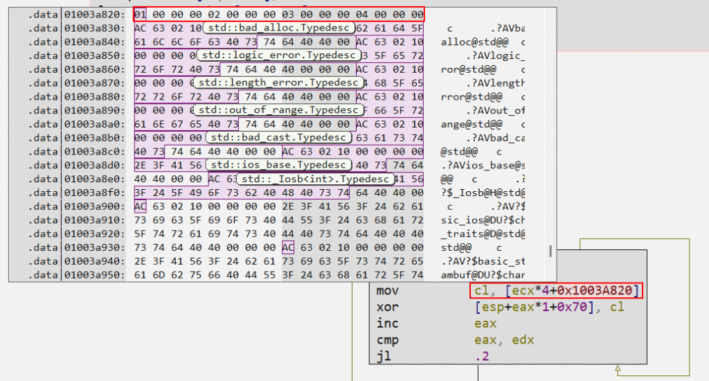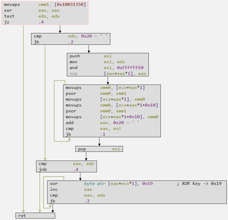 If we take a closer look at the algorithm in the image below, we’ll notice that the instruction and ECX, 0x03 is equivalent to ECX & 3, meaning it keeps only the two least significant bits of ECX, which contain the contents of EAX. In the following instruction, the Claimloader finds the exact address of the XOR key, which is different for each XORed byte in each loop.