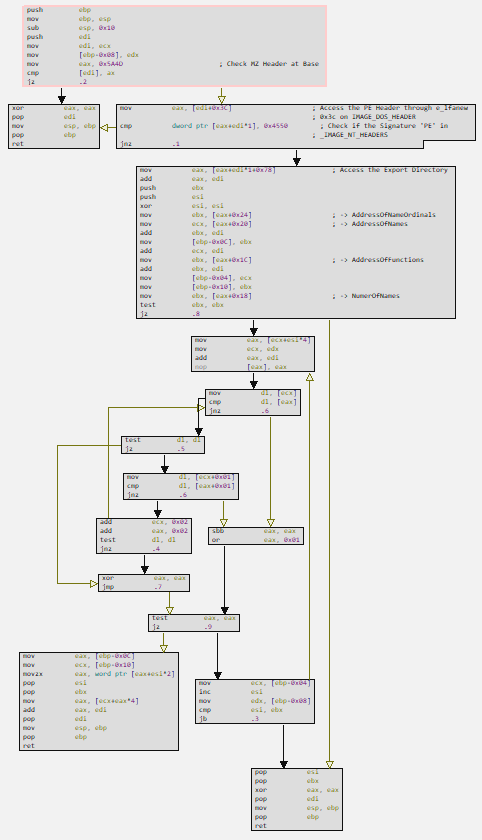 Also when analyzing the pe_parsing_dynamically_load_api function, we validate our hypothesis, which establishes that this function is responsible for parsing the DLL that will have a certain API called dynamically.