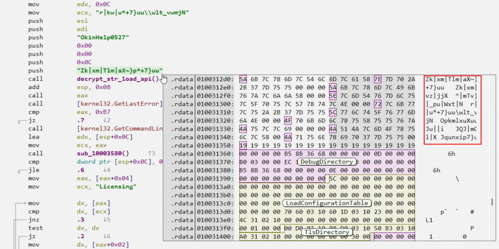 The string decryption routine is quite simple, essentially an XOR operation on a single-byte key. It’s called whenever the Claimloader needs to dynamically load an API. Therefore, all strings encrypted by this algorithm refer to APIs that will be dynamically loaded to implement specific capabilities, primarily allocation, injection, and execution of the next stage (Publoader).