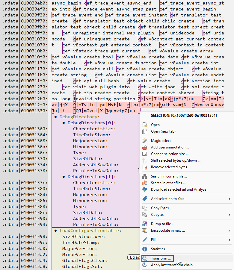 In the following image, we can validate this hypothesis by observing all the encrypted strings in an orderly fashion. Malcat has a feature called Transform, which allows us to transform selected data. Knowing that these strings are encrypted using a simple XOR algorithm, with byte 0x19 as the key, we can decrypt them within the Malcat instance itself.