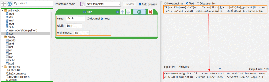 As we saw in the analysis of the first string decryption algorithm earlier, Malcat allows us to perform such actions through the built-in Transform, with many similarities to CyberChef. However, the XOR algorithm described above is an algorithm with custom logic, despite being just a simple XOR.