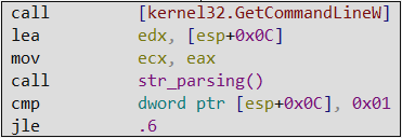 Claimloader expects to receive an argument, which will be identified and parsed in the code block below by collecting the command line using GetCommandLineW, followed by parsing the collected string, which refers to the current process’s command line. Depending on whether the current process’s command line is identified as having an argument (cmp dword ptr [esp+0x0C], 0x01) or not, Claimloader’s code will take two completely opposite directions.
