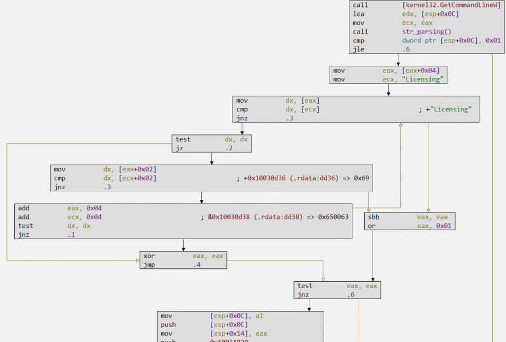 Below, we can see the other flow that will only be executed if the decoy is executed containing the ‘Licensing‘ argument.