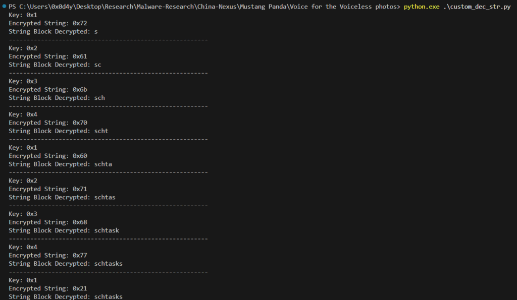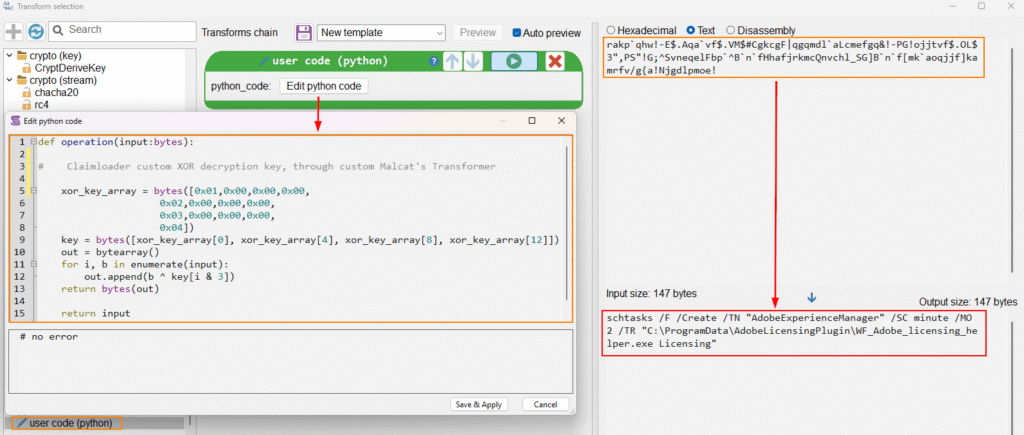 Despite this customization of the XOR algorithm for the persistence implementation command encryption, Malcat allows us to implement a custom Transformer in Python. This custom Transformer allows us to perform the same actions as the built-in Transformers, such as modifying the encrypted string in the code for better analysis.