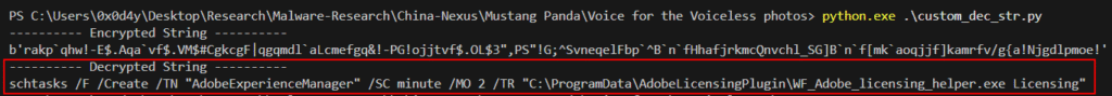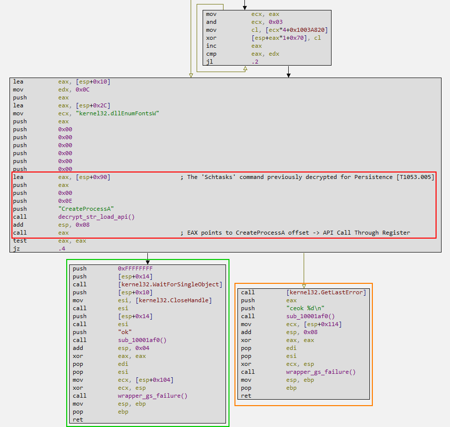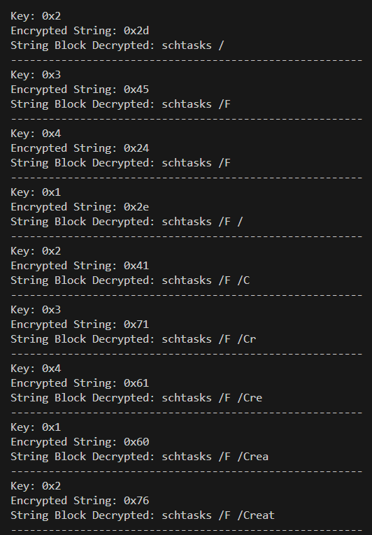 At the end of the loop, we have our decrypted string, revealing itself as a command to be executed, implementing another persistence technique described by MITRE ATT&CK as T1053.005, through the Schtasks.exe binary.