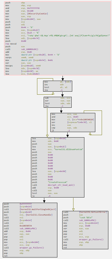 Below, we can see a simple and direct code flow in this function, in which the decryption of a large string will be performed, using a different algorithm than the one we analyzed previously, followed by the creation of a process at the end of this function.