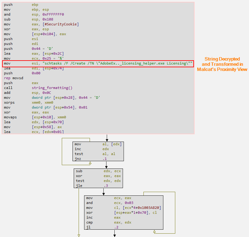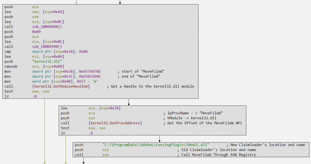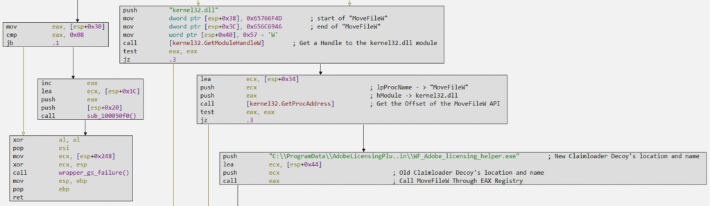 Next, the Claimloader dynamically loads the MoveFileW API using stack strings, which will be moved to the ECX register to be used as the argument (lpProcName) of the GetProcAddress API. After loading, the API is called indirectly through the offset pointer stored in the EAX register. At the end of this block, the decoy will be moved and renamed to the full path “C:\ProgramData\AdobeLicensingPlugin\WF_Adobe_licensing_helper.exe“.
