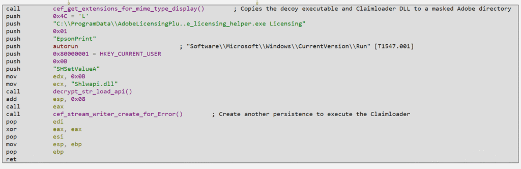 After these code blocks are executed correctly, the function will return to the main function, where Claimloader will create the persistence for the \Run registry key, explained previously, with the following command as an argument:
