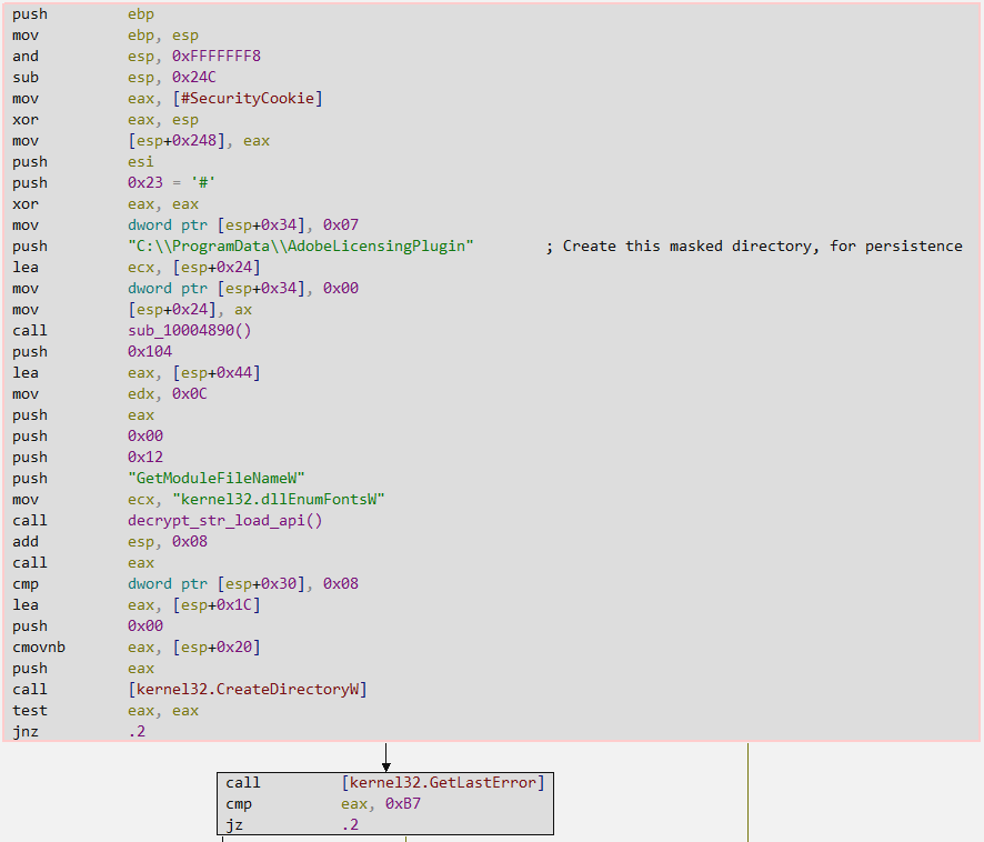 In the image below, we can see the creation of the C:\ProgramData\AdobeLicensingPlugin directory through the CreateDirectoryW API.