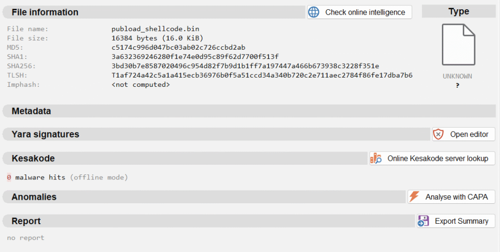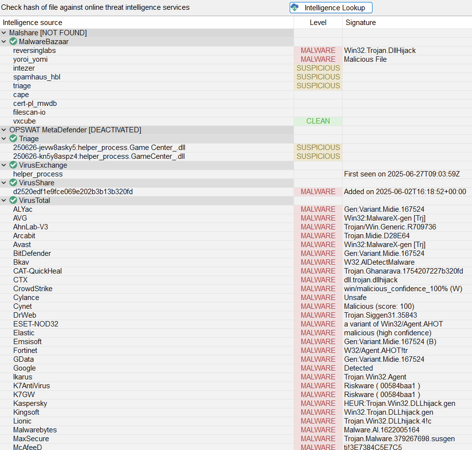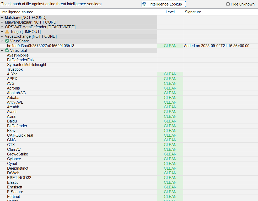 To complete this initial screening, I also used the built-in Intelligence Lookup feature, which, through a pre-configuration of API keys, allows us to check the existence and verdict of this sample in widely known services, such as VirusTotal, VirusShare, Triage, Malshare, MalwareBazaar, etc.