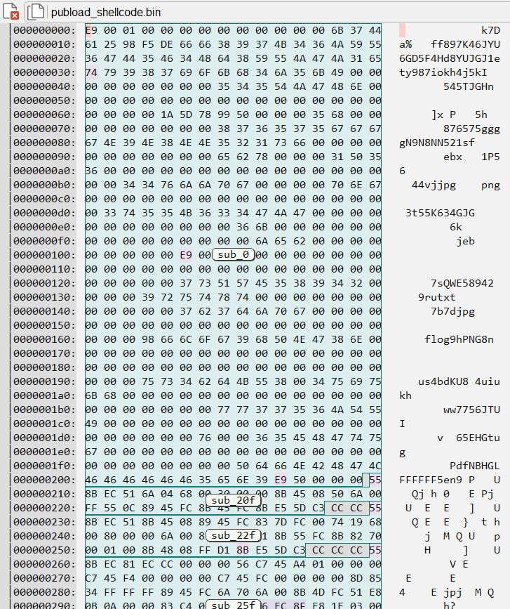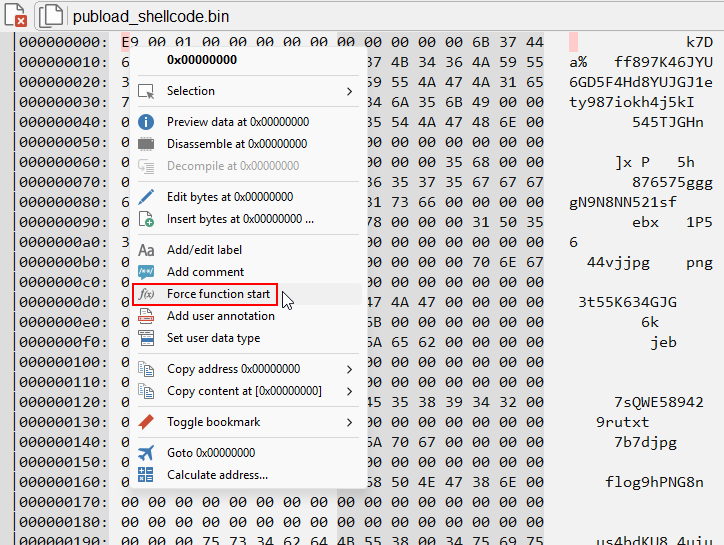 But, to force Malcat to structure it, we just need to go to the Hexadecimal editor tab, and force Malcat to start a function in the first byte of the file (0xE9 is a classic opcode for JMP).