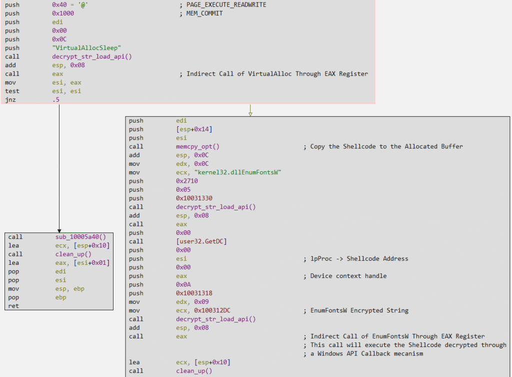 After copying the shellcode to the previously allocated buffer, in the image above we can also see that the offset of this buffer will be used as an argument for the EnumFontsW function call, which, when called, will execute the shellcode by abusing the API’s Callback mechanism. The lpProc argument of EnumFontsW expects to receive a pointer to the application-defined callback function. Therefore, by passing the offset of a shellcode to this argument, EnumFontsW will execute the shellcode.