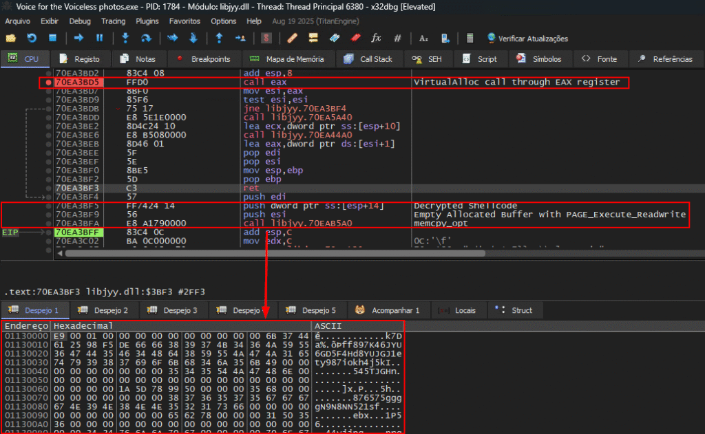 To extract the Shellcode that will be decrypted, we can use the dynamic analysis methodology through x32dbg, by understanding where we should be to extract it correctly.