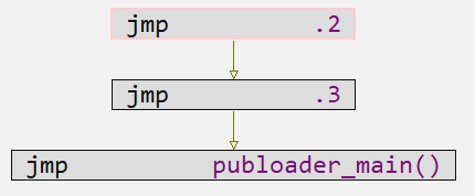 The first function consists of two sequences of JMPs followed by a last one that actually points to a function, which consists of the function with the main functionalities of the Publoader Shellcode.